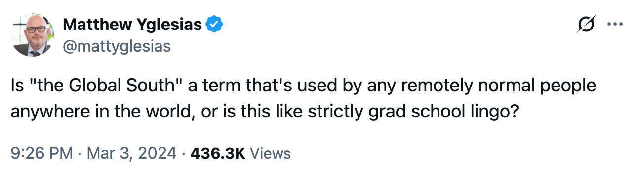 Perhaps this is the real irony of the proliferation of a term like “Global South”: that it represents not so much a display of newfound authority by former subalterns, but rather further proof of American hegemony even as its relative material power may be in decline. It’s not that other nations may not be prone to their own species of bullshit (the French have been known to produce it in great volumes), but it is telling how much they have come to parrot that particularly American version of empty consultant-speak with concepts that sound like branding statements on LinkedIn. Such terms practically come with their own PowerPoint slides.