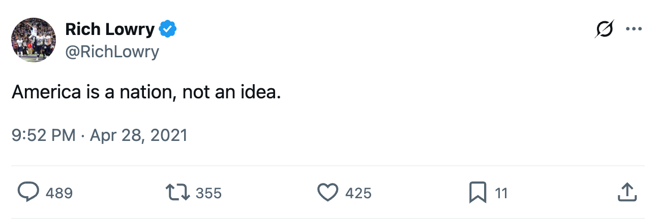 More on this anon, but the more sensible rejoinder to the above would be that yes, of course America is an idea (or a proposition, to use Lincoln’s language, which I personally prefer, because it’s Lincoln). But more to the point, the nation itself is an idea—not just in the sense that someone had to come up with the idea of nations in the modern sense of the word (though that’s more or less true), but that every nation is a kind of idea. Benedict Anderson famously called them “imagined communities,” coining a term that would stick in the minds of many who never even read his book by that title.