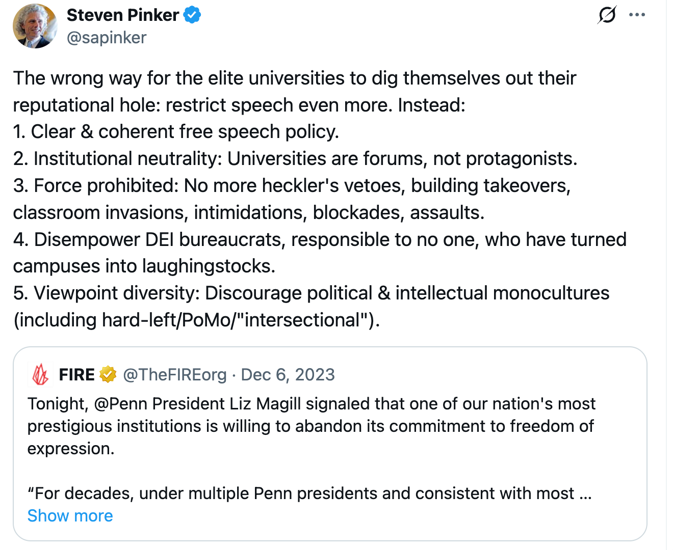 At this point, it might not be possible to say anything interesting about free speech, but here goes: the importance of freedom of expression is overstated in the public commentary about the state of academia. I am really not trying to be a Yglesias-style contrarian here. Here's an example of what I mean. Psychologist, Harvard Professor, and all around public intellectual Steven Pinker issued a proposal for a return to robust free speech norms on campus in response to both the general clampdowns we've seen over the past few years and the more recent calls to restrict speech associated with violence against Jews: